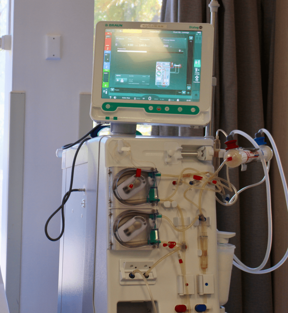 The actual machines are similar with one major difference. Each patient is given a credit card type of identifier, to be inserted into the facility’s scale upon entering. It records your weight and then is inserted into your assigned dialysis machine. At the end of the session, the card is returned to you to weigh out.